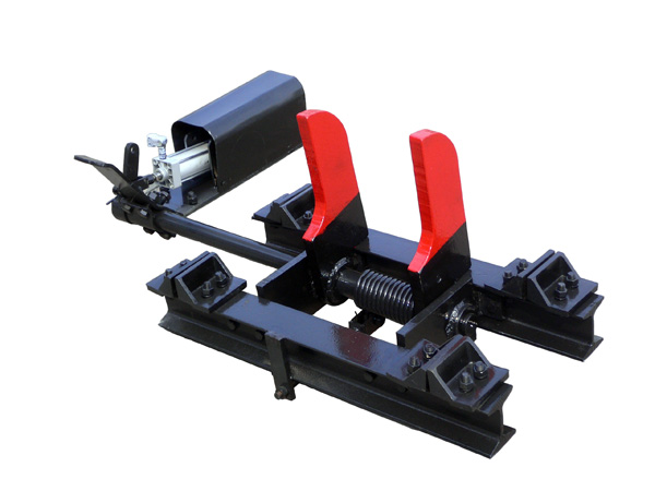 本實用新型公開了一種氣動阻車器,包括刀擋、扭簧、力把、氣缸、軸架、軸、限位板和拉桿,軸架固定在限位板上,軸的遠端穿過扭簧鉸接在軸架上,刀擋固定在軸上并與扭簧上端連接,扭簧下端固定在拉桿上,力把下端固定在軸的近端,力把上端與氣缸鉸接。該氣動阻車器結構簡單,安全可靠,可以人工控制,也可以遠程控制,實現(xiàn)集中自動化管理。
